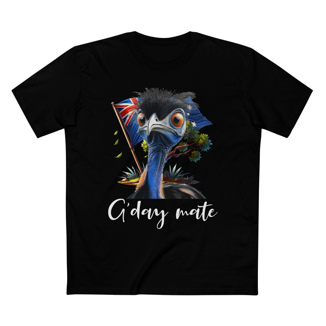Aussie Cassowary T-Shirt — "G'day Mate" with Australian Flag Back design